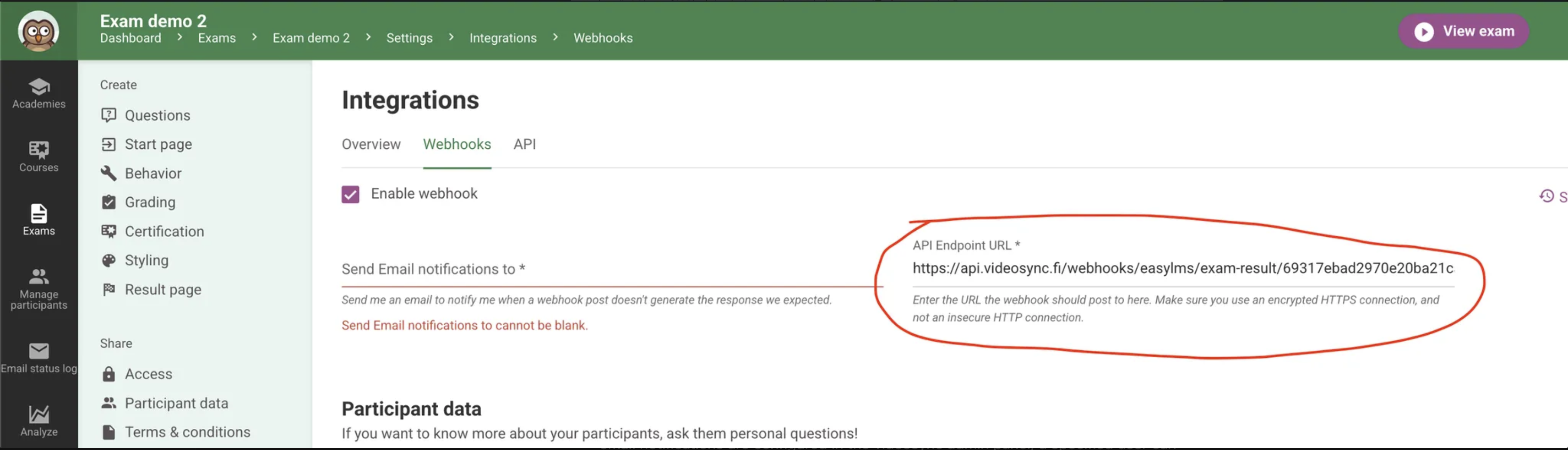 An Easy LMS Webhook allows you to receive email notifications about completed exams and also view exam completions in the Analytics Dashboard. Webhooks are a completely optional feature, you can skip this if you do not need email notifications and exam statistics in Analytics Dashboard.